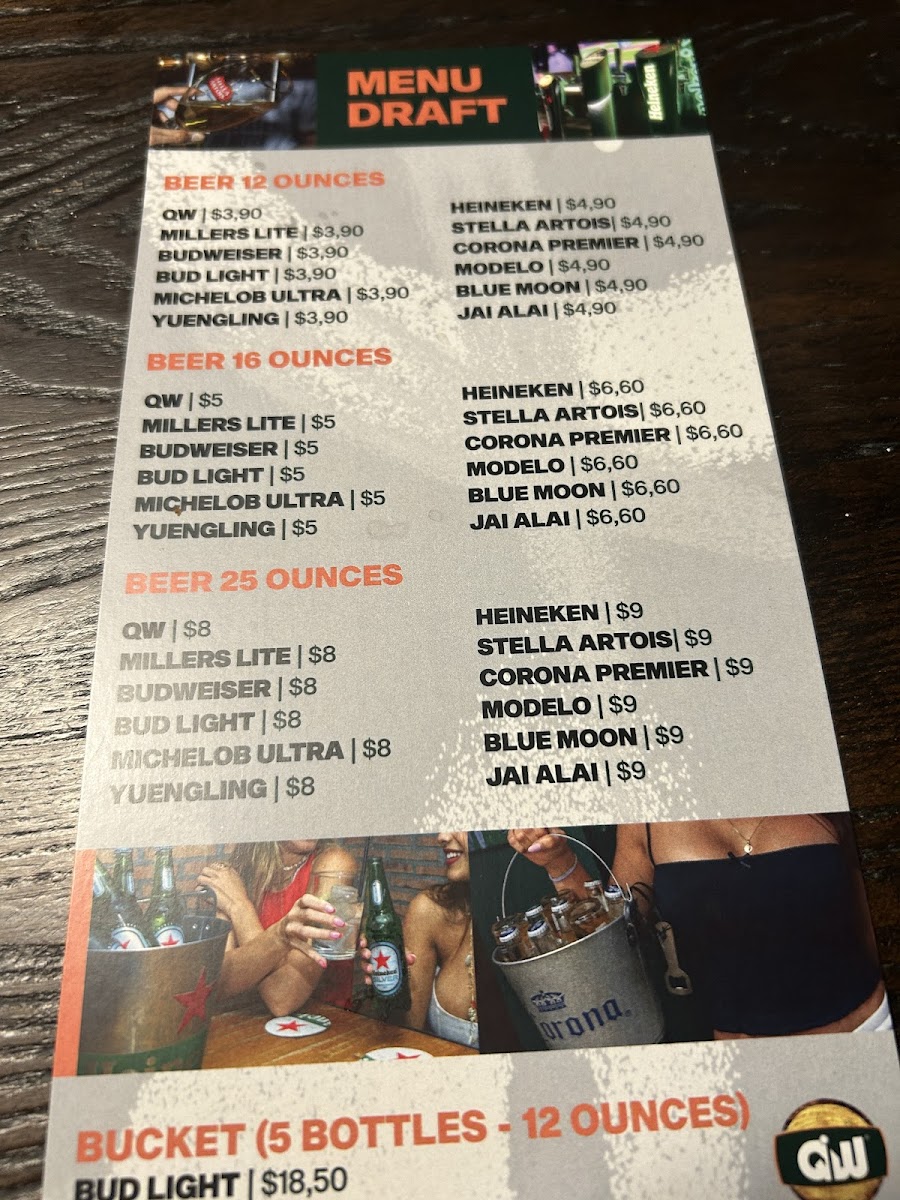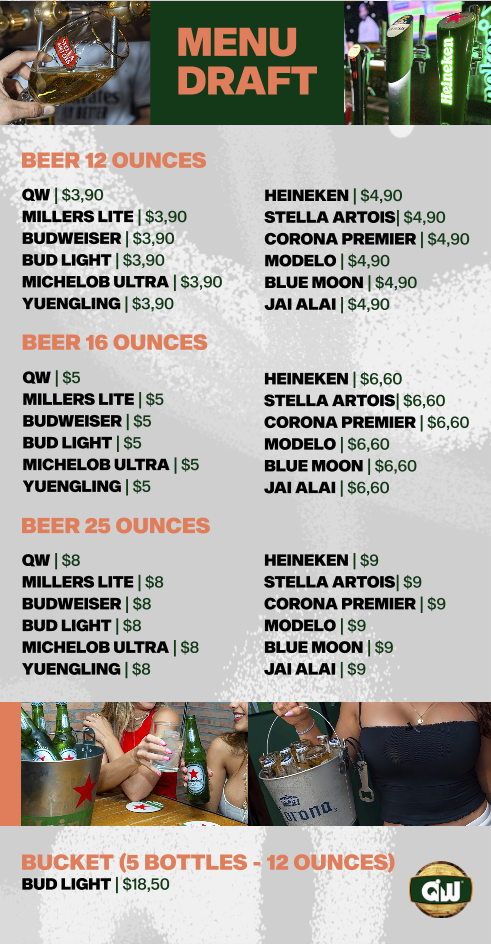 QW 5 MILLERS LITE 5 BUDWEISER 5 BUD LIGHT 5 MICHELOB ULTRA 5 YUENGLING 5 HEINEKEN 6,60 STELLA ARTOIS 6,60 CORONA PREMIER 6,60 MODELO 6,60 BLUE MOON 6,60 JAI ALAI 6,60